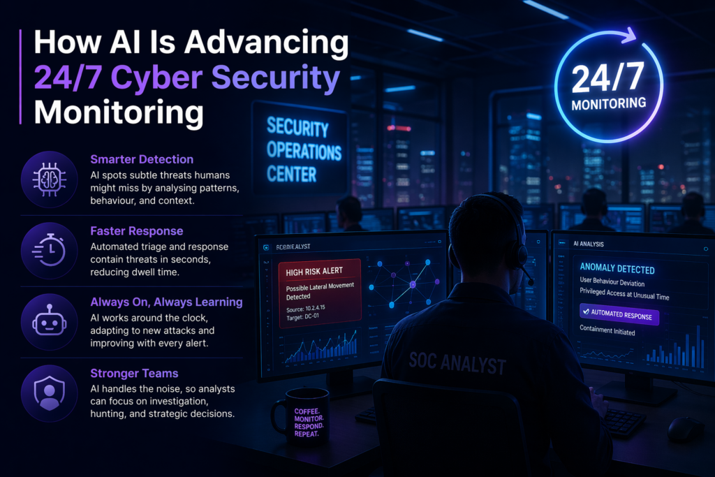In a world where cyber threats don’t clock off at 5 p.m., 24/7 cyber security monitoring isn’t optional. The difference today is that we now have the means to transform ‘always-on’ from a manpower-heavy necessity into a smart, scalable strategy driven by AI.