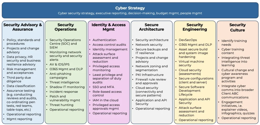 A cyber security team monitors for threats, triages alerts, contains incidents and closes the loop with lessons learned, all to reduce business disruption and data loss. A modern team combines people, processes and tooling such as EDR, SIEM and IAM to operates 24×7 where needed.
