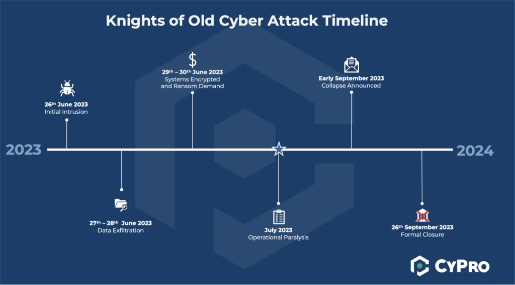 The Knights of Old cyber attack unfolded over several months in 2023, starting with a single breach and ending in the closure of a 158-year-old logistics company. Below is a concise timeline outlining how events progressed, showing where delay and disruption compounded the impact. A visual timeline diagram could help illustrate this sequence clearly for readers and training sessions.